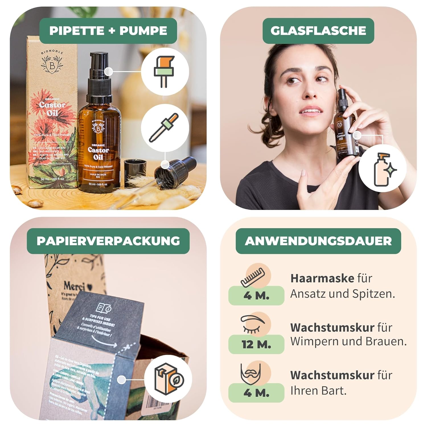 Why Choose Bionoble Organic Castor Oil, 50 ml, 100% Pure, Natural and Cold Pressed, for Eyelashes, Eyebrows, Hair, Beard, Nails, Vegan and Cruelty-Free, Glass Bottle + Pipette + Pump